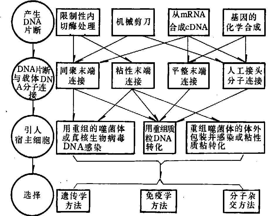重组DNA片段的取得 主要的方法有: ❶利用限制酶取得具有粘性末端或平整末端的DNA片段; ❷用机械方法剪切取得具有平整末端的DNA片段,例如用超声波断裂双链DNA分子; ❸经反向转录酶的作用从mRNA获得与mRNA顺序互补的 DNA单链,然后再复制形成双链DNA (cDNA)。例如人的胰岛素和血红蛋白的结构基因都用这方法获得; ❹用化学方法合成DNA片段。从蛋白质肽链的氨基酸顺序可以知道它的遗传密码,依照这个密码用化学方法人工合成基因。 DNA 片段和载体的连接 DNA 片段和载体相连接的方法主要有四种: ❶粘性末端连接。每一种核酸内切限制酶作用于DNA分子上的特定识别顺序,许多酶作用的结果产生具有粘性末端的两个DNA片段; 把所要克隆的DNA和载体DNA用同一种限制酶处理后,再经DNA连接酶处理,就可以把它们连接起来; ❷平整末端连接。某些限制性内切酶作用的结果产生不含粘性末端的平整末端,用机械剪切方法取得的DNA片段也是平整的;在某些连接酶(例如感染噬菌体T4后的大肠杆菌所产生的DNA连接酶)的作用下,同样可以把两个这样的DNA片段连接起来; ❸同聚末端连接。在脱氧核苷酸转移酶(也称末端转移酶) 的作用下可以在DNA的3′羟基端合成低聚多核苷酸; 如果把所需要的DNA片段接上低聚腺嘌呤核苷酸,而把载体分子接上低聚胸腺嘧啶核苷酸,那么由于两者之间能形成互补氢键,同样可以通过DNA连接酶的作用而完成DNA片段和载体间的连接; ❹人工接头分子连接。在两个平整末端DNA片段的一端接上用人工合成的寡聚核苷酸接头片段,其中包含有某一限制酶的识别位点; 经这一限制酶处理便可以得到具有粘性末端的两个DNA片段,进一步就可以用DNA连接酶把这两个DNA分子连接起来。 导入宿主细胞 将连接有所需要的DNA的载体导入宿主细胞的常用方法有四种: ❶转化。用质粒作载体所用的方法; ❷转染。用噬菌体DNA作载体所用的方法,这里所用的噬菌体DNA并没有包上它的外壳; ❸转导。用噬菌体作载体所用的方法,所用的噬菌体在离体情况下包上蛋白质外壳,所以称为离体包装; ❹注射。如果宿主是比较大的动植物细胞,则可以用注射方法把重组DNA分子导入。 选择 用以上任何一种方法连接起来的DNA中,既可能包括需要的DNA片段,也可能包括并不需要的片段,甚至包括互相连接起来的载体分子的聚合体。所以宿主细胞中只有一小部分是真正含有所需要的基因的。一般通过三种方法可以取得所需要的宿主细胞。❶遗传学方法。对于带有抗药性基因的质粒,从被转化细菌是否由敏感状态变为抗药的状态,就可以知道它有没有获得这一抗药性质粒; 一个抗药性基因中间如果接上了一段外来的DNA片段,就使获得这一质粒的细菌不再表现抗性; 把一个带有氨苄青霉素抗性和四环素抗性基因的质粒pBR322,用限制酶Bam HI处理,由于BamHI的唯一的识别位点是在四环素抗性基因中,所以经同一种酶处理的DNA分子片段就可以连接在这一基因中间; 在被转化的细菌中选择只对氨苄青霉素具有抗性而对四环素不具抗性的细菌,便可以获得带有外来DNA片段的载体的细菌; ❷免疫学方法和分子杂交方法。当一个宿主细胞获得了携带有载体上的基因后,细胞中往往就出现这一基因所编码的蛋白质,用免疫学方法可以检出这种细胞。分子杂交的原理和方法同样可以用来检测这一基因的存在(见分子杂交技术和基因文库)。 基因表达 在构建重组DNA分子和选择宿主细胞时。还须考虑外源基因表达的问题。即要求外来的基因在宿主细胞中能准确地转录和转译,所产生的蛋白质在宿主细胞中不被分解,最好还能分泌到细胞外。为了使外源基因表达,需要在基因编码顺序的5′端有能被宿主细胞识别的启动基因顺序以及核糖体的结合顺序。两种常用的方法能用来使外源基因在宿主细胞中顺利地表达。❶在形成重组DNA分子时,在载体的启动基因顺序和核糖体结合顺序后面的适当位置上连接外源基因。例如将兔的β-珠蛋白基因或人的成纤维细胞干扰素基因分别连接到已经处在载体上的大肠杆菌乳糖操纵子的启动基因后面,便能使它们在大肠杆菌中顺利地表达。 ❷将外源基因插入到载体的结构基因中的适当位置上,转录和转译的结果将产生一个融合蛋白。这种融合蛋白质被提纯后,要准确地将两部分分开,才能获得所需要的蛋白质。在早期的遗传工程研究中,生长激素释放抑制因子和鼠胰岛素基因的表达,都是通过将它们连接在β-半乳糖苷酶基因中的方式实现的。 应用 主要有以下几个方面: 发酵工业 用大肠杆菌生产人的生长激素释放抑制因子,是第一个成功的实例。在9升细菌培养液中这种激素的产量等于从大约50万头羊的脑中提取的量。这是把人工合成的基因连接到小型多拷贝质粒pBR322上,并利用乳糖操纵子β-半乳糖苷酶基因的高效率启动子,构成新的杂种质粒而实现的。现在胰岛素,人的生长激素、胸腺激素α-1、干扰素,牛的生长激素,乙型肝炎病毒抗原和口蹄疫病毒抗原等都可用大肠杆菌发酵生产,其中有的还可以在酵母或枯草杆菌中表达。利用遗传工程手段还可以提高微生物本身所产生的酶的产量,例如可以把大肠杆菌连接酶的产量提高500倍。 理论研究 应用重组DNA技术可以克隆和扩增某些原核生物和真核生物的基因,从而可以进一步研究它们的结构和功能。重组DNA技术及其提出的问题促进了遗传学