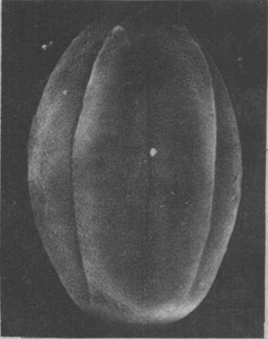 野坝子花粉粒形态(×2300) 花粉多数为近球形,少数为长球形或扁球形,极面观为6裂圆形,赤道面观为扁球形(见图)。花粉大小为25.05~28.39微米。具6沟,沟细长,末端尖,沟与赤道垂直。外壁厚度约为1. 5微米,层次明显, 外层厚于内层, 表面具颗粒状或由颗粒组成的短条纹状雕纹。 |