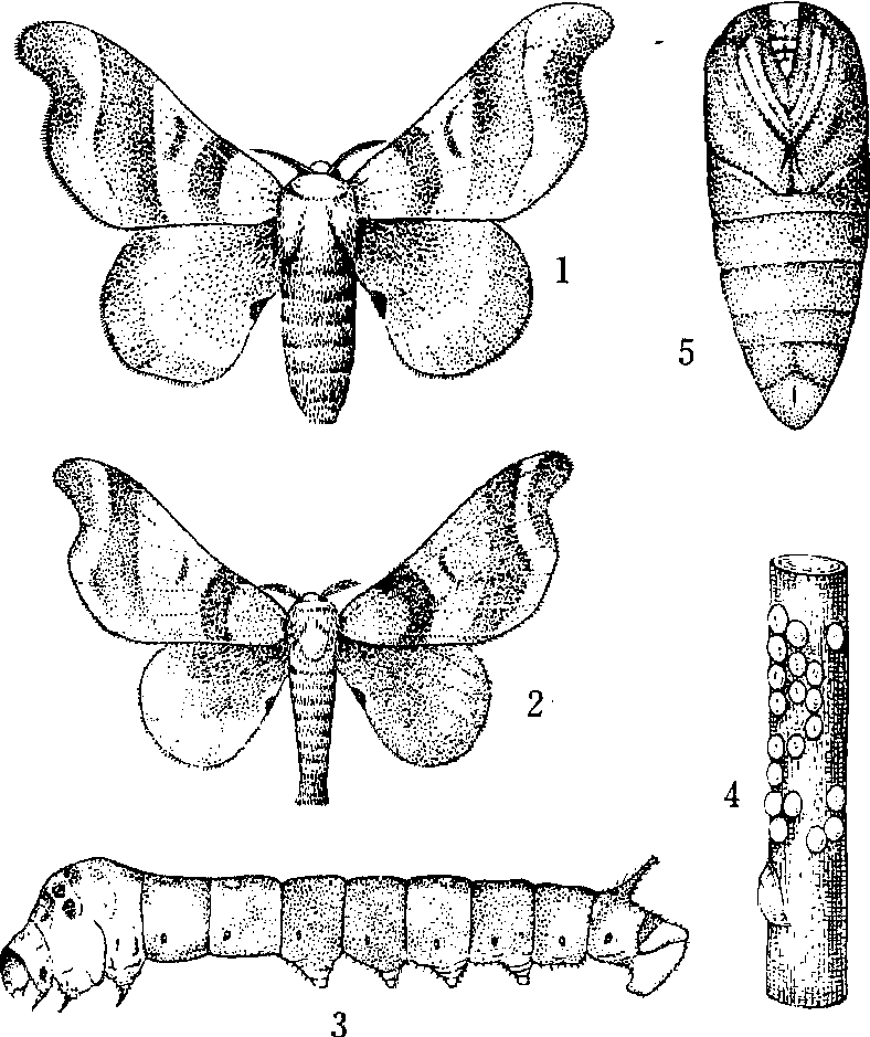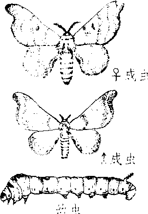分布为害 野桑蚕分布中国、朝鲜、日本。中国各地均有发生。寄主除桑外,还有构树。以幼虫咀食桑叶,尤喜食嫩叶,为害严重时,常将整片桑园嫩叶吃尽,影响树势和桑叶产量。 防治 冬季刮除产在枝干上的越冬卵;捕捉幼虫,摘除蛹茧;用80%敌敌畏2,000倍液、90%晶体敌百虫3,000~5,000倍液或60%双效磷3,000倍液喷杀幼虫。对寄生卵的野桑蚕黑卵蜂,寄生幼虫的桑蟥寄蝇,寄生蛹的野桑蚕黑瘤姬蜂,都是有效天敌,要保护利用。 野桑蚕wild mulberry silkwormBombyx mandarina Moore,又称野蚕。鳞翅目,蚕蛾科。分布于中国、日本和朝鲜半岛。成虫体长15~20 mm,灰褐色,前翅翅尖下方有弧形凹陷。卵扁平卵圆形,中央略凹陷。成长幼虫体长约32 mm,头小,胸部膨大,体褐色有斑纹,第8腹节上生一尾角。幼虫食害桑叶,长江流域一年发生4代,以卵在桑树枝干上越冬。寄主除桑外,还有构树。防治方法:捉幼虫,采蛹茧;用90%敌百虫或80%敌敌畏或50%辛硫磷1 500倍液喷治。