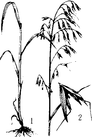 野燕麦 1.植株 2. 小穗 野燕麦一年生草本,高60—120厘米。叶片扁平。圆锥花序开展,金字塔形,小穗含2—3花。花果期4—9月。产青河、乌鲁木齐、精河、和布克赛尔、塔城、伊宁、新源、巩留、特克斯、昭苏、巴里坤、和静、焉耆、乌恰、莎车、叶城、塔什库尔干等地。具有营养价值,可作粮食和饲料,秆可作造纸原料。 |