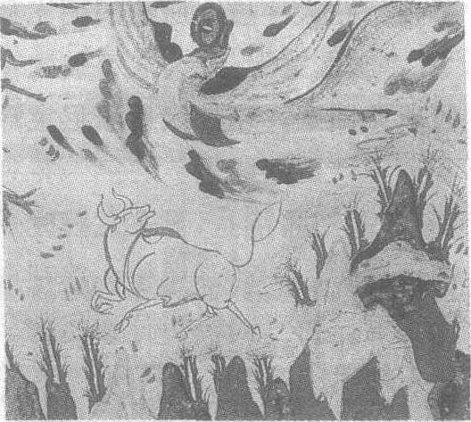 | 释义 | 野牛图壁画西魏。甘肃省敦煌县莫高窟第249窟窟顶北披壁画。野牛位于北披的下部,以白描手法对其刻画,土红色的线条简洁流畅,运用自如,使野牛的形象十分生动。牛体态强健,四肢灵活有力,虽被猎人追赶的一群黄羊与它还有相当距离,但它怕殃及自身,故拔腿而逃,且边跑边回首,显然是起步不久,充分表现了野牛的机警。其奔跑回首的姿态也十分漂亮,显示出力量型动物的特点。