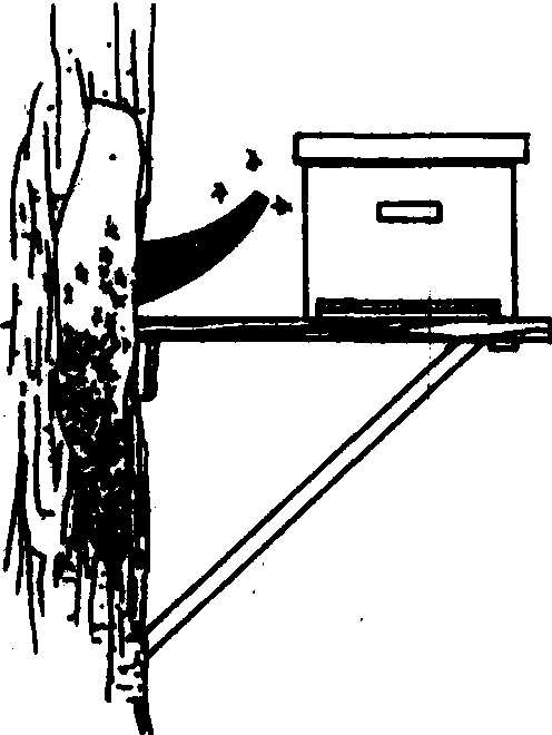 图1 诱捕蜂箱、蜂桶摆放的位置 搜捕 根据野生蜂营巢习性,找到营巢的地点后进行人工收捕。搜捕应在春、夏季蜜蜂繁殖和采蜜季节进行。森林边缘的空心树干,阳坡上的洞穴、坟穴可作为主要搜寻目标。此外捕捉采集工蜂,用细丝线轻轻绑在蜂腰部,一端贴一块小纸片,然后释放、跟踪,即可找到蜂巢。在晴朗天气的9~11时,守候在山坳出口处,观察回巢工蜂的飞行路线,若有5~7只回巢工蜂飞向同一方向,即可以沿此方向进行跟踪,找到蜂巢。发现野生蜂群后,可在傍晚携带喷烟器(或艾条)、收蜂笼(见捕蜂器)、巢框、面网(见防护用具)、蜂箱等主要工具以及开挖洞穴的刀、斧、凿、锄等进行收捕。收捕树洞里的蜂群时,先扩大洞口,用喷烟器驱蜂离脾结团,然后割脾装框,再用收蜂笼收捕,或用木勺舀取蜂团进箱。移入大部分工蜂并找到蜂王后,将蜂箱巢门靠近原洞口,使外勤蜂自己爬入蜂箱。若蜂王飞起,可略等片刻,待其返还。收捕树洞、岩洞中的野生蜂群,首先用泥土封闭多余的进出口,保留一个主要进出口(图2)。然后用脱脂棉花蘸以50%石炭酸, 塞入蜂巢下方, 在留的洞口插入一个导管(玻璃管或塑料管), 管口的另一端通入蜂箱;蜂群受石炭酸气体所驱迫,纷纷通过导管。工蜂大部出洞后,即可将蜂箱搬走。原洞穴恢复原状,以便引诱野生蜂群再次利用其巢穴,供下次再收捕。