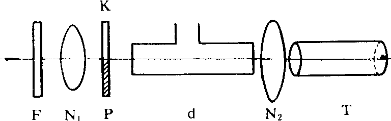 | 释义 | 量糖计liangtangji测量旋光性能的仪器。又称旋光仪或偏振计。半荫旋光仪的结构如图所示。N1和N2分别为线起偏器和线检偏器,K为半波片,P为与K等厚、等吸收的玻璃片,K和P密接成半荫片,d为盛放旋光液体的管,T为望远镜,F为滤光片。白光自左方入射,通过F后可认为是单色光(一般为黄色),以避免旋光色散。从N1出射的是线偏振光,入射到KP,从P出射的仍是原线偏振光,而从K出射的虽也是线偏振光,但光振动方向转过了一个角度。T准焦于KP的交界线,此时若转动N2,两半视场的亮度一般是不等的。当N2的透振方向转到某一方向,这个方向与两个光振动方向所成夹角的平分线相垂直,这时两半视场具有较暗的相等亮度,从而看不到分界线,人眼察觉这种现象是十分灵敏的。N2的这个方位叫做半荫位置。N2调节到半荫位置后,在d中放入待测的旋光液体,从K和P出射的线偏振光的振动面同步旋转。再把N2转到新的半荫位置,转过的角度就是振动面转过的角度ᵠ。再由ᵠ=[α]dc,式中d为光在液体中通过的路程,[α]和c分别为液体的旋光率和浓度。测出d和ᵠ,若已知c,即可定出[α];若已知[α],就可测出c。还可把ᵠ的刻度换成c的刻度,直接读数。这种仪器常在制糖工业中用来测量糖的纯度;在制药工业中,测定可卡因、尼古丁和樟脑等具有旋光性物质的浓度。在化学和制药工业中,分析和研究液体的旋光异构体时,也要利用量糖计。