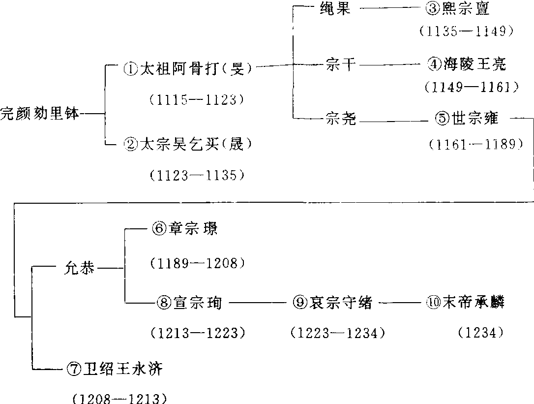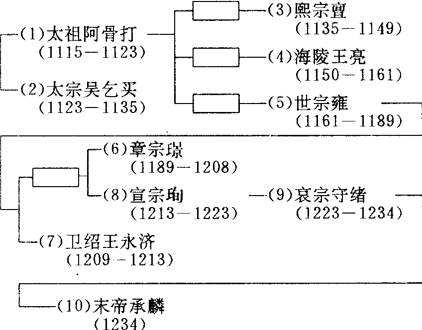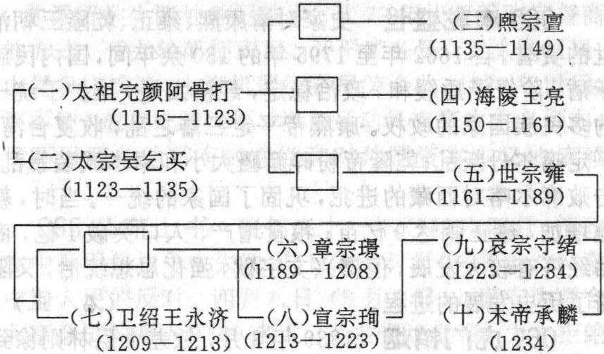 | 释义 | 045 金1115—1234女真族建立的政权。1115年女真族完颜部首领阿骨打称帝,建国号金,都会宁(今黑龙江阿城南)。天会三年(1125)金太宗灭辽国。1126年灭北宋。其间曾把都城从会宁迁到中都(今北京)、开封。疆域北到外兴安岭,南与南宋政权接界,东到大海,西与西夏政权接界。天兴三年(1234),被蒙古和南宋联合灭掉。传9帝,历120年。 金世 系 表