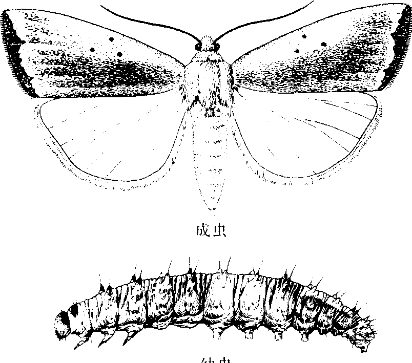 图2 翠纹金刚钻 埃及金刚钻 学名Earias insulana (Boisdu-val)。成虫体长7~12毫米,前翅暗绿色,前横纹W形,后横纹与亚横纹V形。末龄幼虫体长10~15毫米,唇基乳白,下方微暗。腹足趾钩13~17个,臀足趾钩16~18个。蛹长8~15毫米,肛侧突5~8个。寄主有野苘麻、棉和猪屎豆等。第一代幼虫2月中旬至3月下旬发生,4~12月每月可发生1代。夜间羽化为成虫,午夜后到翌日早晨交配,交配后次日产卵。卵散产于嫩头、花蕾、铃柄、边心及苞叶上。幼虫发育起点温度约为12℃,有效积温407日度。印度曾观察到埃及金刚钻与翠纹金刚钻在自然环境中杂交。从11月到翌年2月羽化的成虫前翅斑纹有明显变异,有些与翠纹金刚钻前翅斑纹相似。 为害习性 初孵幼虫以取食棉株嫩头、嫩叶为主,稍大后蛀食花蕾、棉铃。嫩头被害后枯萎折断,幼蕾被害变褐枯死脱落,大蕾被害苞叶张开脱落。为害花时取食花蕊、咬断柱头不能结铃,为害青铃多从基部蛀入,取食棉子和纤维,小铃常脱落,大铃常烂铃或成僵瓣,影响棉花产量和品质。 影响为害的主要有气候、寄主、棉种、栽培制度和天敌等因素。 气候影响种群组合 云南、广东气温终年在18℃以上,翠纹金刚钻和埃及金刚钻成为华南棉区的主要为害种,在云南干旱时以埃及金刚钻为主,湿润时以翠纹金刚钻为主。长江流域棉区冬季温度低,以鼎点金刚钻为主。 寄主植物是虫源地和桥梁 金刚钻可以在棉花与其他寄主间来回取食为害,使棉花不断遭受重害。云南金刚钻寄主植物达4科17种之多,在棉花收获时,一株野苘麻上可达70多头虫。 混栽棉区有利于金刚钻转移为害 华南部分棉区棉花有春播、秋播、宿根棉和再生棉之分,在混栽地区,金刚钻常转移为害并终年繁殖。长江流域棉区一熟棉初期重,两熟棉后期重,但均较华南棉区为轻。 金刚钻对棉花品种的选择性 按为害程度依次为亚洲棉、陆地棉、海岛棉。同一地区同时种植不同品种,因播期、生育期不一,利于金刚钻转移选食。 天敌 埃及曾利用短角茧蜂进行防治收到成效。江苏南通棉区,金刚钻蛹被寄生达57.2%,其中费氏大腿蜂占87%,有效地抑制了金刚钻的为害。金刚钻的捕食性天敌有小花蝽、三色长蝽、普通长脚胡蜂、窄姬猎蝽、华姬猎蝽、大眼蝉长蝽、食卵赤螨、中华猎蝽、瓢虫、蜘蛛等。寄生性天敌有金刚钻直径绒茧蜂、金刚钻曲径绒茧蜂、金刚钻角额姬蜂、金刚钻柔茧蜂、大腿蜂、红铃虫甲腹茧蜂、螟铃悬茧姬蜂、花腹姬蜂、地蚕大铗姬蜂、黑姬蜂等。印度有勒氏小茧蜂寄生幼虫,金刚钻驼姬蜂寄生蛹。 防治方法 中国棉区金刚钻种群组合南北不同。在鼎点金刚钻为主的发生地区宜掌握好早春发生基数,即于5月上旬开始利用蜀葵、木槿等寄主植物诱卵,分析发生基数和出现早迟。也可采用黑光灯诱蛾,在蛾量突增后10天即为棉田卵量剧增日,可定出防治适期。对硫磷、辛硫磷、敌百虫、甲萘威对幼虫均有较好防治效果,对硫磷可同时治虫杀卵。在野生寄主多和多季植棉的华南地区,可采取截断食物链恶化产卵取食条件和合理用药的综合防治措施。改种一季棉、棉粮轮作、早拔秆灭残茬、早播密植、早打顶、打群尖、早灌早追肥、早熟早收等农业措施也有一定效果。运用无食料季节消灭虫源地、躲过为害高峰、控制棉田种群密度、保护和利用天敌,逐年推行可减轻为害。 |