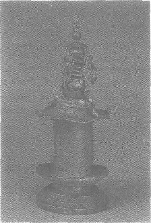 | 释义 | 金塔辽。通高25厘米,檐径10厘米。1967年辽宁省阜新县塔营子辽塔地宫出土。辽宁省博物馆藏。此塔通体金片制作,分数段套合而成。塔下为圆形须弥座,上下枭各有三层迭涩,捶覆仰莲、卷草与牡丹花叶纹。塔身圆筒形,正面錾出一壶门形长龛,周围錾字,由龛左起绕读,依次记偈语、造塔愿文与《法舍利真言》。塔檐插出瓦垅,周缘饰火珠。檐顶捶覆莲、加圈饰,内镶珍珠,与塔刹的莲座共合成为一组覆仰莲装饰。塔刹高耸,穿宝珠、相轮、华盖等饰,刹尖为一葫芦形火珠。华盖周缘下垂璎珞,系以小珍珠粒、小金叶与镂孔三花式金叶交错穿缀而成,技艺精巧。
