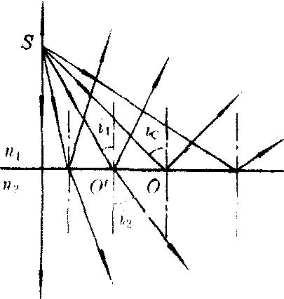 光从光密媒质入射到光疏媒质界面时产生全反射现象的最小入射角。图中示出了光从光密媒质(折射率为n1)入射到光疏媒质(折射率n21)界面的情况。按照折射定律,折射角i2随入射角i1的增加而增加,并且总有i2>i1。当入射角i1趋近于某一角度ic时,折射角i2将趋近于90°。当入射角i1≥ic时,光线不再进入光疏媒质,折射光线消失,此时光线全部被反射回光密媒质,即产生了全反射现象。ic为产生全反射现象的最小入射角,即为临界角。由折射定律可知,临界角ic的正弦值等于光疏媒质折射率n2和光密媒质折射率n1之比,即