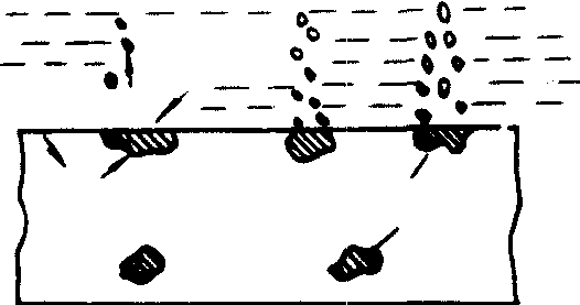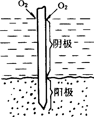 形成腐蚀电池示意图 一根铁桩打入水底的泥中,靠近水面的部分由于其周围含氧气浓度高 (从空气中扩散进来),电极电势较正而成为阴极,埋入泥沙中的部分氧气浓度低,电极电势较低,成为阳极,分别进行下列反应: