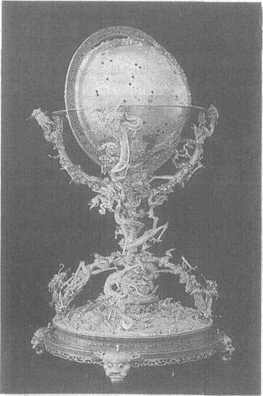 | 释义 | 金嵌珠天球仪清。乾隆(公元1736—1795年)时制作。北京故宫博物院藏。天球仪,又称浑天仪或天体仪,是古代观测天体运行的仪器。这是一件天球仪的模型,用黄金做球体,两端中心为南北极,并贯以轴,在北极有表盘,上有赤道、黄道、子午圈、地平圈及秋分、春分点等刻纹;球体上有用珍珠镶嵌的星辰,光彩耀目,有三垣(紫微垣、太微垣、天市垣),28宿,成百上千颗星星;球下有云龙支架,錾九条金蟠龙,其爪支撑地平圈,四条云龙衔接掐丝珐琅托盘,中心有指南针,四兽足驮伏着托盘。