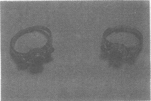 明。直径2.4厘米。1956年2月湖北省圻春县圻州镇刘娘井村刘氏墓出土。湖北省博物馆藏。此戒指扁圆形,戒面突起部分呈花形,上面分别嵌以三块红、绿宝石。