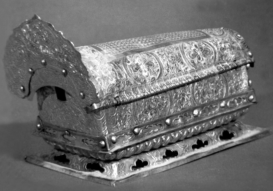 | 释义 | 金棺jinguan宋代舍利葬具。1987年5月武功县报本寺塔地宫出土。棺体呈前高后低,状如今木棺,由盖、帮、底座三部分组成。盖、帮厚不足0.5毫米,以榫铆相接,盖镂饰贯线纹,座为须弥座,棺头上端呈弧形并饰二相对的嘉陵频伽鸟。金棺长17.8厘米,大头高10.6厘米,宽9厘米;小头高7.5厘米,宽7.6厘米。重331.5克。现藏武功县文物管理委员会。