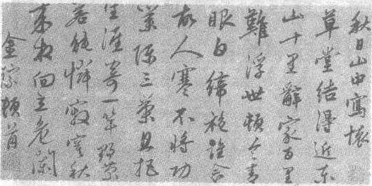 | 释义 | 金琮行书山中写怀诗卷明。纸本。纵25厘米,横52厘米。广东省博物馆藏。金琮(正统十四年—弘治十四年,即公元1449—1501年),字元玉,曾游赤松山,自号赤松山农,金陵(今江苏南京)人。好吟咏,为金陵才子之一。屡试不第。工画墨梅,有杨补之笔意,工书,十二三岁即能作大字。《明史》附《顾璘传》后有传。此行书卷《山中写怀诗》是《明各家书翰卷》中的一段,依次有吴宽等十家手迹,卷后有詹景凤、方康侯、翁方纲、罗惇暖、张学华、叶恭绰等跋。其中翁方纲自乾隆三十八年(即公元1773年)—嘉庆九年(即公元1804年),曾先后在卷上五次题记,他称:“金元玉手迹至为难得,此乃亦有之,辛丑春寄至吴门裱装,甲辰春还于苏斋。”金琮诗“秋日山中写怀:草堂结得近东山,十里辞家百里难,浮世顿令青眼白,缔袍谁念故人寒。不将功业陈三策,且把生涯寄一竿,野菊若能怜寂寞,秋来相向立危阑。金琮顿首。”计12行66字。行书师赵孟頫的笔法,墨色酣畅淋漓,秀润华滋,含筋裹骨,结构严谨,是金琮的佳作。