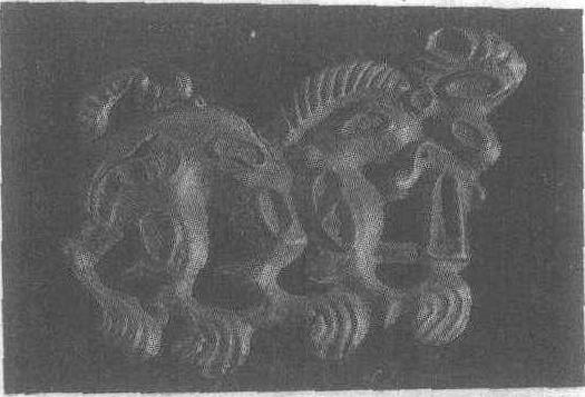 北魏。长9厘米,高7.7厘米。1984年6月内蒙古自治区科尔沁左翼中旗希伯花鲜卑墓出土。内蒙古自治区通辽市博物馆藏。此器系铸造而成,图案为一奔走状的瑞兽。通体有椭圆形浅槽,原好似有镶嵌物。整体造型奇特,具有浓郁的鲜卑族风格与特征。