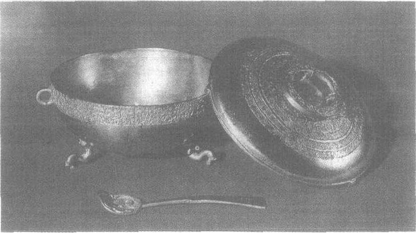 金盏、金勺 这套金质用具为饮食用器,盏内盛放食物,勺身镂孔,是为从汤汁中捞取食物。金盏是已发现最早、最重的金质器皿,重2.15千克。此盏、勺出土于曾侯乙墓中,为墓主生前使用的贵重器物,为同出的金器中的精品,代表了战国金属工艺的高超水准。 |