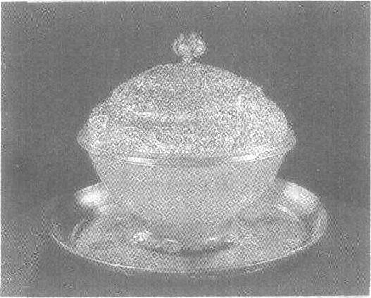 | 释义 | 金盖玉碗及金托盘明万历。通高15厘米。金盖高8.5厘米。重148克。金托盘直径20.3厘米。重325克。1956年北京市定陵万历皇帝墓出土。北京市定陵博物馆藏。这套碗由金盖玉碗和金盘组成。碗为青玉琢磨而成。敞口、弧形腹、圈足,内外光素无纹,抛光细腻,莹润纯洁。盖纽为莲花形,盖面以镂空的卷草纹为地,其上錾出金龙,盘托为圆盘形,中央有一周凸起,内放置玉碗,凸起的外边缘为一周如意形云纹,盘内的其余部分满饰线刻龙纹。这套碗具富丽堂皇,工艺十分精湛,是皇家用品,否则难以达到如此高的水准。