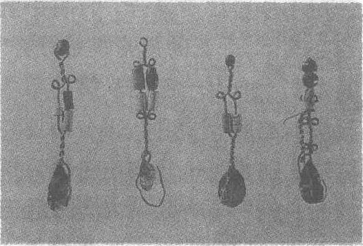 | 释义 | 金耳坠西汉。长6.8厘米—8厘米。1956年辽宁省西丰县西岔沟墓群出土。辽宁省博物馆藏。此耳墜非出同一墓中,但形制与作法大体相同。系以一根直径约1毫米的金丝拧成双股直绳,至其尽端分开,一股拗曲成钩,以挂于耳上;另股则拍扁成叶状,用以遮蔽耳孔。有的将其一段绳又分为单股,并各绕出一些对称的小环,在其上穿缀绿石和白石管状珠、六瓣瓜棱形红玛瑙珠、扁圆形蓝琉璃珠等,五色间杂,灿丽夺目。