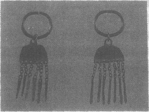 金耳饰❶晋代东胡族装饰品。1960年辽宁义县保安寺晋墓出土。现藏辽宁省博物馆。高8.9厘米。粗金丝耳环下悬一半圆形金片,底垂金链流苏六或七行。佩戴相碰撞时有细碎响声。此耳饰形制特殊,且较大而重,该为少数民族风格。在日本也有相类似的金耳饰出土。 |