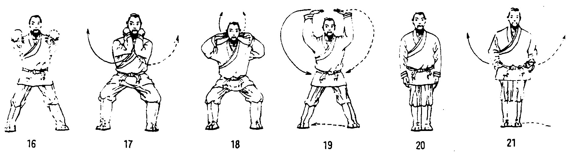 ❽拍还原成并步站立,两手握拳收于腰侧。(图21)要点:臂的旋转幅度宜大;意守劳宫;握拳时中冲点劳宫。