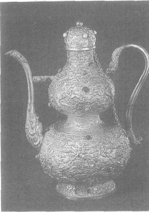 | 释义 | 金錾龙纹葫芦式执壶清。高29厘米,腹径16厘米,最宽25厘米。北京故宫博物院藏。执壶是清代皇帝的御用酒器。此壶作葫芦形,龙首柄,曲流上錾龙纹。柄下端有一金链与壶盖相连。壶体部分锤錾二龙戏珠纹样,并以流云补托为地,宝石、珊瑚镶嵌其间。壶盖錾西番莲花,用珍珠做花芯。圈足,上錾刻海水杂宝。执壶造型典雅,装饰华丽,采用了锤、錾、刻、嵌等多种工艺技术,十分珍贵。