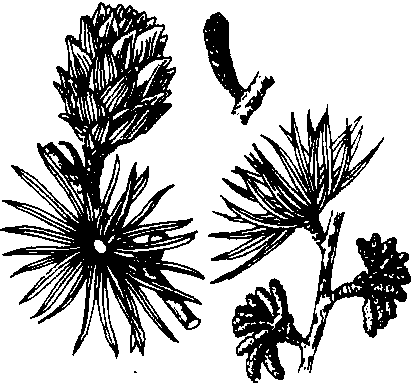 金钱松 金钱松松科落叶乔木。高达60 m,胸径1.5 m。树皮灰褐色。大枝不规则轮生。叶在长枝上螺旋状排列,散生,在短枝上簇生状,辐射平展呈圆盘形,线形柔软,长2~5.5 cm,宽1.5~4 mm。叶上、下面都有气孔线。雄球花簇生于短枝顶端,雌球花单生于短枝顶端,直立。球果当年成熟,卵圆形,直立,长6~7.5 cm。种子卵圆形,有翅。子叶4~6,发芽时出土。产江苏南部、安徽、浙江、福建、江西、湖南、四川东部、湖北西部。中国特产的单种属优良用材树种。秋叶金黄如钱,树姿美丽,是世界著名的园林观赏树种。 |