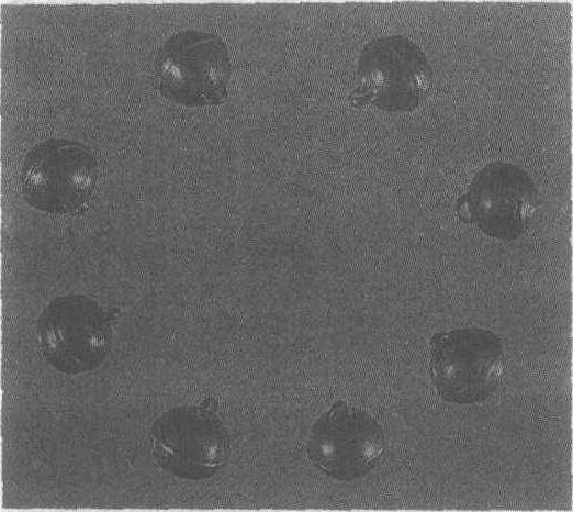 晋。直径2厘米。1957年辽宁省北票县房身2号墓出土。辽宁省博物馆藏。此铃系以两金片压成半球形后对口扣接而成。铃顶有环形鼻,底部切一长条形口。铃内以铁丸为胆,琅琅作响。铃面光洁如新。