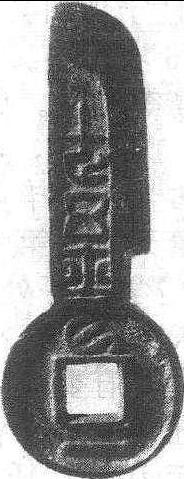 | 释义 | 金错刀新王莽(约公元7—9年)。环2.87、通长7.52、厚0.55厘米,重34克。环文篆字上曰一,下曰刀,铸时字凹,以黄金填之,使与面平。柄文亦篆字,日平五千。此为王莽居摄二年(7年),进行货币改革时发行的3种新货币之一。按当时规定,一枚金错刀相当于五铢钱5000枚。其状奇异,制作精绝,存世稀少,人皆珍秘之,旅顺博物馆藏。