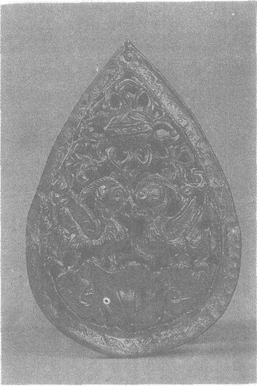 元。长7.5厘米,宽5.1厘米。1959年江苏省吴县吕师孟墓出土。南京博物院藏。此器系用两片金叶经锤压成鸡心形,镂空刻花,上镂百结图,底雕荷花,衬托出一对相向的鸳鸯,以“百年和合”、“鸳鸯比翼”、“连生贵子”之意构成一幅充满吉祥气氛的荷花鸳鸯图案。器内盛装香料,器尖钻一小孔,以穿链索系于身上。