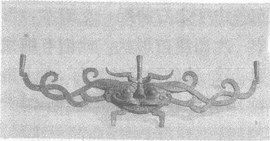 | 释义 | 鎏金兽面形铜支灯西汉。高17.2厘米,宽57.2厘米。1983年广东省广州市象岗山南越王墓出土。广州市南越王墓博物馆藏。此灯为兽面扁圆形,瞪目露齿,下有弯曲的座,头顶上双角间铸一管状烛插。兽首两侧伸出卷云式的角,两端亦各有一管状烛插。遍体鎏金。三个烛插上都刻有编号,同出三件,每件三烛插上各有数字,分别为“一、二、三” ,“五、六、七”,“九、十、十一”。疑三灯原与两件单烛插的灯一起陈放,故缺少“四”、“八”两号。