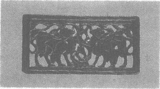 西汉。高4.8厘米,宽9.5厘米。1956年辽宁省西丰县西岔墓群出土。辽宁省博物馆藏。此饰牌为长方形,四周边框上有连续的针叶纹。中间图案为对向的双驼,昂首而立,足微向前作欲迈状。口衔嘉禾,禾穗披于身侧,禾秸盘结,展罩在驼身之上。该牌面的鎏金已有磨蚀,与绿色的铜地相映,金碧交辉。