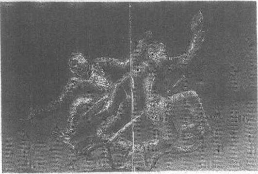 | 释义 | 鎏金歌舞透花铜扣饰西汉。高12厘米,宽18.5厘米。云南省晋宁石寨山出土。云南省博物馆藏。歌舞者为二位通体鎏金着戎装佩长剑的男子。他们脑后挽一小结,双臂摆开,跣足踏在一条弯曲的蟒蛇上边歌边舞。音乐的节奏响亮、明快,在热烈的气氛中,他们大放歌喉,欢快无比。文献中,如:《蛮书》《黔书》《宣和书普》《滇游续笔》等有不少关于西南地区古代民族能歌善舞的具体记载。石寨山出土青铜器中关于歌舞内容的器物还有“八人乐舞”“四人乐舞”扣饰等。从这些玲珑剔透的青铜装饰艺术品中,我们不仅看到了滇族工匠们高超的技艺,同时更为古代滇人热爱生活,憧憬未来的蓬勃生机所感染——大自然是慷慨的,生活是艰辛的,索取必须付出,劳动创造了世界。