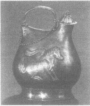 | 释义 | 鎏金舞马纹银壶唐代制品,1970年出土于陕西省西安市何家村窖藏中,现为陕西历史博物馆收藏。壶高18.5厘米,口径2.2厘米,足径8.8×7.1厘米。造型如北方少数民族使用的皮囊,下有圈足,足内墨书“十三两半”。壶腹两侧有模冲出的舞马各一匹,马口衔杯,腹、足结合处饰同心结 一周。壶腹的装饰表现的是宫廷祝寿场景,唐玄宗时曾驯养一批骏马,它们能闻乐起舞,八月五日,皇帝生日,大宴百官,舞马于兴庆宫勤政楼下,曲终,舞马跪拜献寿,玄宗赐酒,舞马衔杯自饮,壶腹的装饰就是这个情景。但是,舞马下场凄惨。安史之乱爆发,一些舞马辗转归了叛将田承嗣,而田不知其功用。一次,军中饮宴,马仍闻乐起舞,马夫以为妖奇,抽打它们,舞马以为舞得不好,愈加奋首鼓尾,田承嗣知道后,命属下痛打,以致舞马暴死枥下。