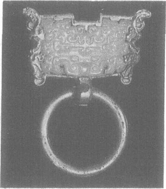 | 释义 | 鎏金铜嵌玉铺首西汉早期。通长12.4厘米,宽9.4厘米。1968年河北省满城县中山靖王刘胜墓出土。河北省文物研究所藏。铺首为门扉上的环饰,商周时期的青铜器上也用它做装饰,形象多为兽首衔环。此铺首以铜、玉制成,玉琢成梯形,上宽下窄,上饰浮雕兽面纹,隙地处饰卷云纹,玉饰外随形镶以铜边,左右两侧铸成对称的螭虎,螭虎首外昂。下侧中央的铜钩衔一圆环,形象似兽面衔环。铜体鎏金,部分有脱落。刘胜见“镂雕双螭龙纹玉璧”条目。