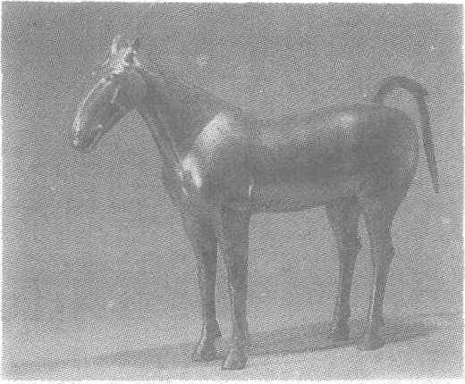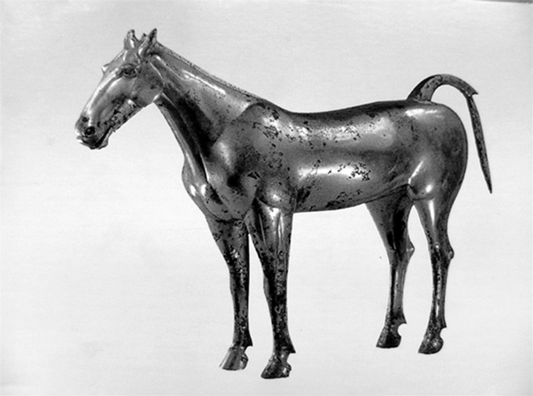 鎏金铜马liujintonɡmɑ西汉。1981年兴平县(今兴平市)汉武帝茂陵东侧第一号无名冢(传为霍光墓)出土。高62厘米,长76厘米,重25.5公斤。马昂首翘尾,两耳耸立,双目炯视,口微张,露齿,耳间、颈上有鬃毛,肌骨瘦劲,筋脉清晰,四蹄直立。据马头双耳之间剪成三棱角的特点推断,此马以西域大宛汗血马为原型制作,马身中空,鎏金匀厚,通体金光灿灿。同出的马具、车饰亦皆鎏金。冶炼和铸造鎏金工艺代高超,是迄今发现鎏金器物中最大、最好的稀世珍品。从同出器铭文及文献资料分析,鎏金铜马应为武帝姊阳信长公主家之物。现藏茂陵博物馆。