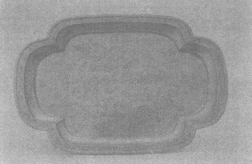 明。高1厘米,长17.1厘米,宽13.4厘米。1958年北京市定陵出土。北京市定陵博物馆藏。此盘侈口,方唇,折沿,浅腹,平底,为椭圆形。盘沿四周刻有三角折线纹,内底刻一对麒麟衔缠枝纹。