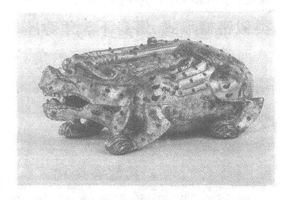 | 释义 | 鎏金镶嵌兽形铜盒石砚东汉。高10.5厘米,宽4.8厘米。1970年江苏省徐州土山东汉墓出土。江苏省南京博物院藏。铜砚盒铸成一爬行动物,其状怪异:双角贴背、张口露齿、双目圆睁,似凝视猎物,作跃跃欲捕状,通体鎏金,并镶嵌有红珊瑚、青金石、松绿松石等绚丽的点缀装饰,光泽灿然;打开盒盖,座内置端石砚一方,还有磨砚的小圆石一块。这既是一件实用的石砚,又是一件可供欣赏的精巧绝伦的斋室艺术珍品。