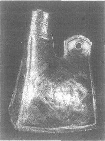| 释义 | 鎏金鹿纹银鸡冠壶辽代制品,1979年在内蒙古赤峰市洞后村一窖藏中出土,现藏内蒙古自治区赤峰市文物工作站。壶高26厘米,底长21厘米,宽16厘米,底部为一块矩形薄铜片,四面与薄银片镶合,做成壶形。壶颈高耸,壶口小而设盖,盖原有链与壶颈的小环相连,使内贮的液体难以泼撒; 壶身上窄下宽,平底,安稳性强,放置时不易倾仄;上方开 一孔洞,以穿绳系带,又便于远途携行; 设计的实用性非常突出。图案錾刻鎏金,以壶腹的卧鹿为主题,角隅、壶侧和颈部为卷草等,大多以鱼子纹为地,纹样和制作技法与唐代酷似。将富于民族特色的造型与继承前代传统的装饰完美结合,难能而可贵。银器中的鹿纹在中亚、西亚、唐代中国已屡见不鲜,而它在辽代的出现可能还与契丹统治集团的秋猎有关,射鹿是其秋猎的重要内容。