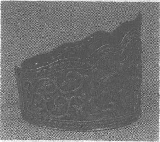 | 释义 | 鎏金龙珠纹银冠辽。通高19厘米,直径20.9厘米。1956年辽宁省建平县张家营子辽墓出土。辽宁省博物馆藏。此器系以鎏金银片捶卷而成的圆筒形冠,开口于头后,可以系结。冠面锤揲花纹,突起如浮雕:中心是五朵作蕃草装饰的如意云纹簇拥着一颗烈焰升腾的火珠;两侧为两只相对的坐龙,张口对珠作吞吐状。整个冠面以细密的卷草纹为地,上下以联珠纹拦边,锤制密排的如意云纹。此冠为契丹贵族用冠,作工精细,代表着辽代金银加工工艺的水平。