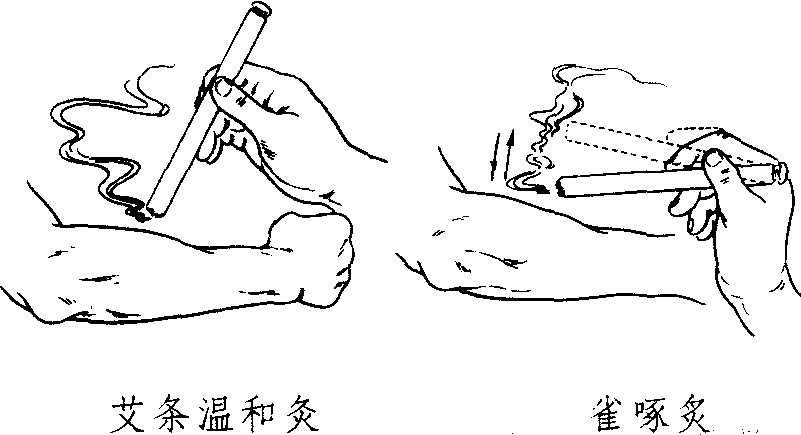 三棱针 用于点刺放血的针具。通过刺破穴位或浅表血络,放出少量血液治疗疾病的方法称刺络法。三棱针一般以不锈钢制成,长约6厘米,针柄呈圆柱形,针身呈三棱形,尖端三面有刃,针尖锋利。三棱针主要用于指趾末端,或局部皮肤病灶,或表浅血络,刺破出血,以治疗各种实证、热证、瘀血和经络瘀滞、疼痛等证。出血不宜过多,勿刺伤深部大动脉。虚证、妇女产后、有出血倾向者禁用。 皮肤针 针头呈小锤形,针柄长15~19厘米,头端是莲蓬状的针盘,下边散嵌着不锈钢短针,根据针支数目,又分称梅花针(五支)。七星针(七支)、罗汉针(八支)等。针尖不宜太锐,宜呈松针形。使用方法是挥动针柄,叩打皮肤,依据用力大小分为轻刺、中等刺、重刺。叩刺方法,一是局部叩刺;一种按经脉辨证循经取穴;第三种是整体叩刺,即先刺脊柱两旁,由背至骶,后刺项部及病变局部。适用范围:头痛、胸胁痛、失眠、四肢痛及腰扭伤、口眼㖞斜、痹证、呃逆、瘘证、胃脘痛、呕吐、腹痛、咳嗽哮喘、遗尿、遗精、阳萎、心悸、眩晕、痛经、小儿惊风、目疾、鼻塞、鼻渊、瘰疠。局部皮肤有溃疡者、有创伤者,不宜用此法。 艾柱 将艾绒做成锥形,每烧尽一个,称为一壮,根据病情决定使用的壮数。艾柱底部一般应有三分范围的大小,年老体弱者可适当减少。艾柱灸法分为直接灸和间接灸两种,直接灸现一般少用,适于哮喘、慢性胃肠病、体质虚弱、发育障碍、眩晕、皮肤疣等。间接灸又分为隔姜灸、隔蒜灸、隔盐灸、胡椒灸、黄土灸、黄蜡灸等,适用于虚寒之腹痛、泄泻、关节疼痛;肺痨、腹中积块及未溃疮疖;急性腹痛吐泻、痢疾、四肢厥冷和虚脱;各种外科阳虚病证;风湿痹痛及局部麻木不仁;背部疔疽初起、局限性湿疹等症。 艾条 以桑皮纸将艾绒卷成圆柱形,其中掺入药物粉末的,又称有药艾条。艾条灸的操作,分温和灸和雀啄灸两种(图2—1—22)。温和灸即将艾条的一端点燃,对准施灸部位,约距0.5~1.0寸左右进行熏灸,使患者局部有温热感而无灼痛,一般每穴灸3~5分钟,至皮肤稍红为度,小儿及老人防止烫伤。雀啄灸是艾条不固定在一定距离,而是上下移动,如鸟雀啄食一般。适宜于各种虚寒证(图2—1—23)。
