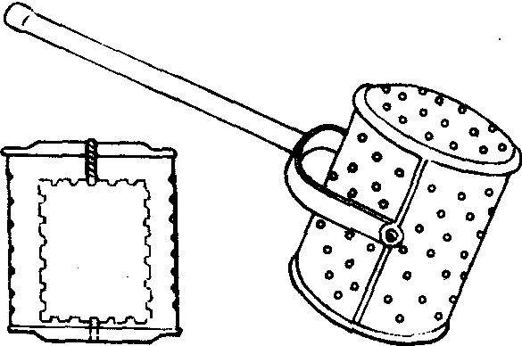 图2—1—23 温针 适用于既需要留针,又需施灸的疾病。针刺得气后,毫针留在适当的深度,将艾绒捏在针柄上点燃,或将针柄上套置一段约1~2厘米的艾条点燃施灸。 温灸器 是一种特制的金属灸具,名为温灸器。先将艾绒及药末放入小筒内燃着,然后在拟灸的腧穴或部位上来回熨烫,到局部发红为止。本法患者乐于接受,尤其适宜老年人自灸(图2—1—24)。
