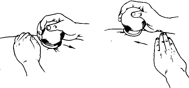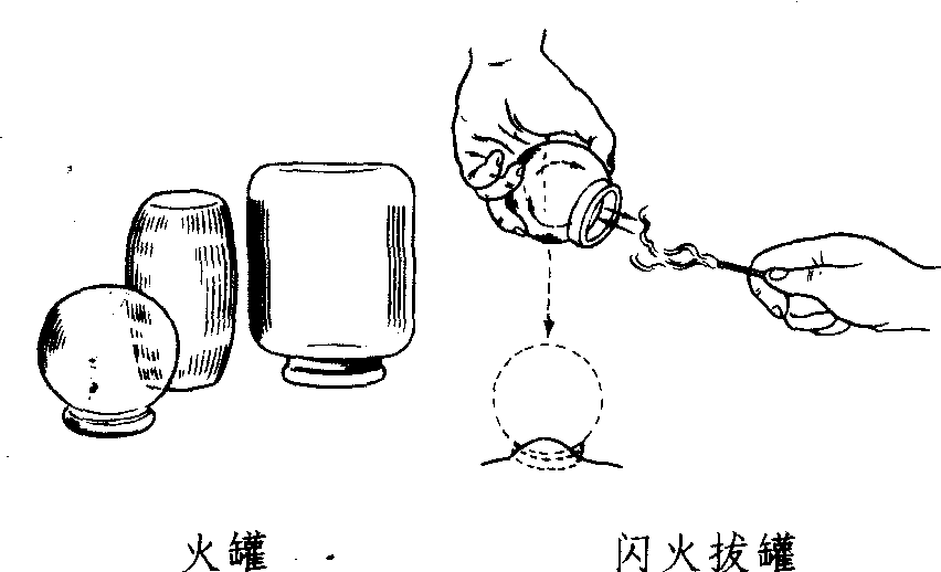 图2—1—26 走罐 火罐 是一种玻璃或陶器制成的杯罐,也有用竹筒的。治病原理是借热力排出杯罐中的空气产生负压,使吸着于皮肤,造成瘀血现象而达到治疗目的的方法。吸拔方法,用长纸条或镊子夹酒精棉球点燃后,在罐内绕一圈,再抽出,迅速将罐罩在应拔的部位上,即可吸住(图2—1—25)。起罐时以一手抵住罐边皮肤,按压一下,使气漏入,罐子即能脱下。临床使用方法有多种:以火罐数目分有单罐、多罐;以火罐停留方法分有留罐、闪罐、走罐;以辅助方法分,有针罐和刺血拔罐。闪罐:罐子拔上后,立即起下,再拔再起,反复多次,至皮肤潮红为止。走罐:用于面积较大,肌肉丰厚部位,如腰背、大腿。罐口要平滑,并在罐口涂润滑油脂,将罐吸上后,以手握住罐底,稍倾斜,后半边着力,前半边略提起,慢慢向前推动,来回数次,至皮肤潮红为止(图2—1—26)。针罐:先在一定部位施针,待达到一定的刺激量后,将针留在原处,再以针为中心,拔上火罐。刺血拔罐:先在病变部位上按刺血法刺出少量血,然后拔火罐。火罐适用于各种疼痛、感冒、咳嗽、以及毒蛇咬伤、丹毒、红丝疔、疮疡初起未溃时。高热,皮肤溃破处及肌肉瘦削、毛发多的部位禁用。 |