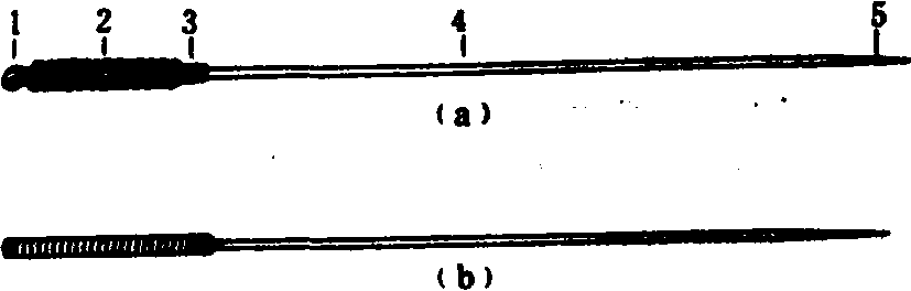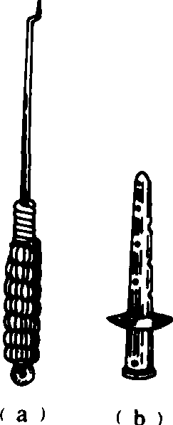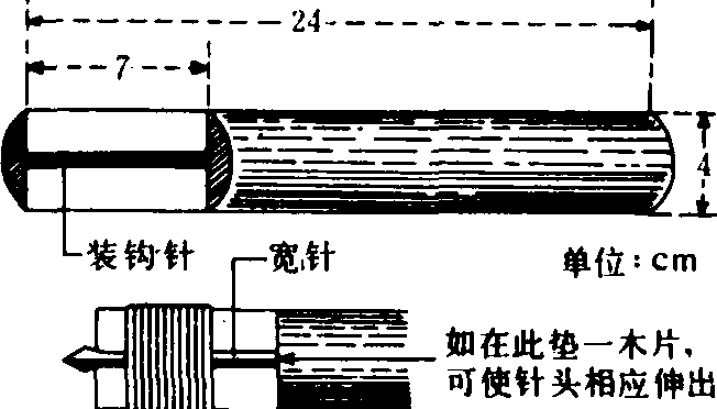 图5 穿黄针 火针 古代称燔针、焠针。现代多以优质钢制成。针尖圆锐,针体光滑,直径约为1.5~2毫米。针柄有木柄、电木柄和金属丝缠绕等多种式样,以金属丝缠绕的居多。常在金属丝内夹垫一层石棉类的隔热物(图6)。