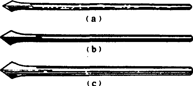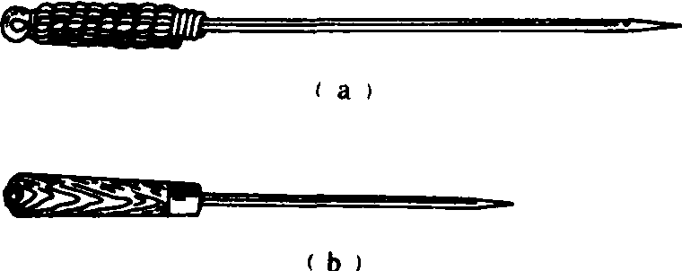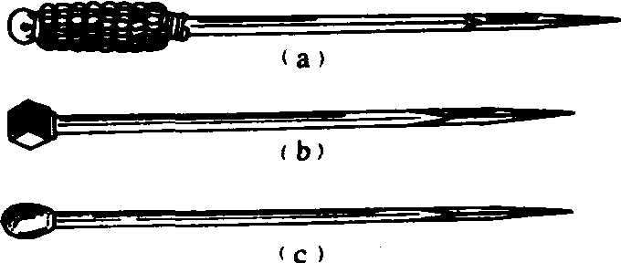 图2 圆利针 三棱针 多用优质钢或合金制成。针身前部呈三棱形, 后部呈杆状。有大、小两种, 主要用于刺玉堂、通关、三江等穴的静脉或静脉丛上(图3)。
