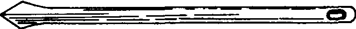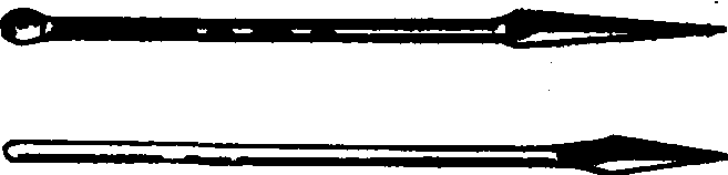 图4 宽针 穿黄针 多以优质钢制成。针的规格和形状与大宽针相似,只是针尾部有一小孔,以穿系马尾(约20根)或棕绳等,作吊黄或穿通黄肿之用(图5 )。