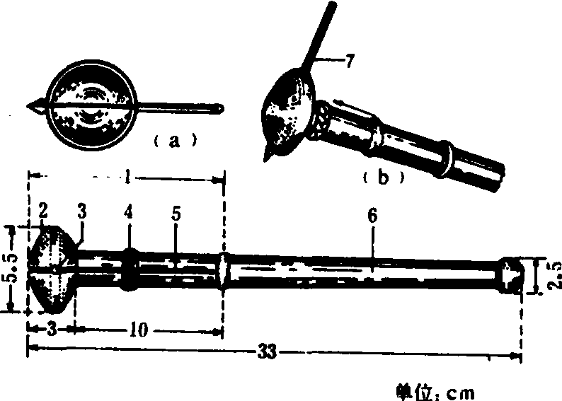 图8 针治附属用具 玉堂钩 尖部具有直径约为1厘米的半圆形弯钩,尖端呈三棱形,很锐利。全长约13厘米。专用于放玉堂血,使用较为方便、安全。 宿水管 一般为铜制的锥形小管,形似笔帽。长约5.5厘米,上有8~10个直径为2.5毫米的小圆孔。当患畜宿水停脐时可以此管放腹水(图8b)。 针锤和针棒 用硬质木料车制而成的持针器。针锤长约35厘米,锤端较粗,其顶端有一椭圆形的锤头。通过锤头中心钻有一横向洞道,用以插针。自锤头至锤体五分之二处沿其纵轴有一道锯缝;锤体外套以皮革或藤制的活动箍,箍推向锤头部则锯缝被箍紧,即可固定针具;将箍推向柄端,锯缝便回弹而松开,即可将针具取下(图9)。针棒长约24厘米,直径约4厘米,在棒的一端约7厘米处锯去一半,沿纵轴中心挖一针沟。使用时,用细绳将针紧固在针沟内,针头露出适当长度,即可进行扎刺。放胸堂、鹘脉和蹄头血时, 可利用针锤操作。而缠腕等四肢下部穴位, 常用针棒, 以防病畜蹴踢(图10)。