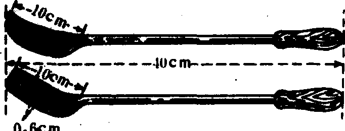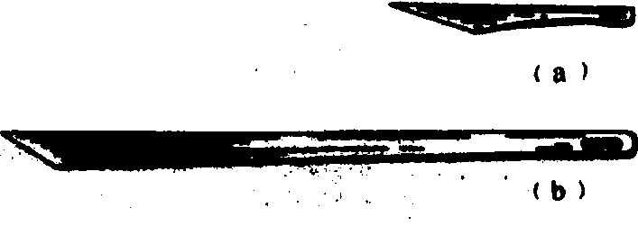 图6 火针 夹气针 扁平长针,针尖呈矛尖状。以竹片或合金制成。长28~36厘米,宽4~6毫米,厚3~3.5毫米。专作大家畜夹气穴的透刺用。 痧刀和眉刀 痧刀长4.5~5.5厘米,针尖最宽部约0.5厘米,刀刃薄而锋利;眉刀形似眉毛,故名。用优质钢制成,全长9.5~12厘米。一般用于治疗猪病,也可用小宽针代替(图7)。