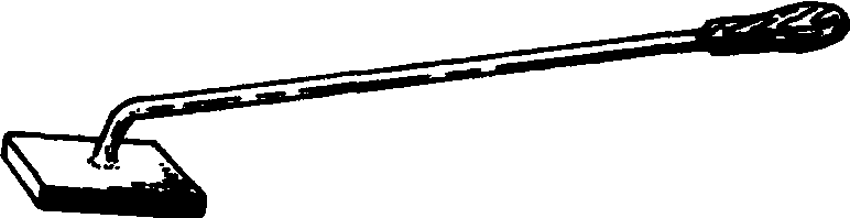 图12 火罐 烧烙工具 除敷料、陈醋及加热用的火炉等器材外, 烧烙专用工具有: ❶刀状烙铁。画烙的专用工具,均呈菜刀形, 刀口长约10厘米,厚约0.6厘米。分尖头和方头两种。刀背较厚, 后接一40厘米长的铁柄, 铁柄与刀背呈钝角, 其末端装有手持用的椭圆形木把(图13)。 ❷方形烙铁。熨烙专用工具。呈长方形, 长约10厘米, 宽约6厘米, 厚约2~3厘米。在背侧正中连接一个弯成钝角的铁柄, 末端也装有木把(图14)。此外还有锥形、球形、柱形以及点状烙铁。