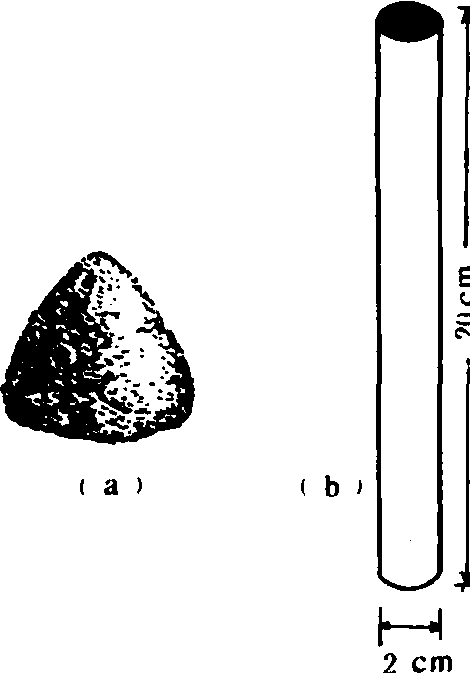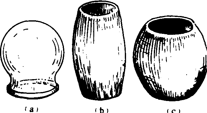 图10 针棒 灸用工具 中兽医灸疗方法有艾灸、醋酒灸、糠(麸)醋灸、蒜灸、姜灸、桑枝灸、烟草灸、酒精灸、花椒大蒜灸、油捻灸、硫黄灸、火筷灸、熨斗熨灸、刮痧灸、拔火罐等。其中艾灸, 拔火罐、刮痧等需要特制工具备用。❶艾灸:一般使用艾绒制成的艾炷或艾条。艾炷是将纯净的艾绒放在平板上, 用手指搓捏成圆锥状(图11a)。其大小因施术病畜的畜种和病情而有不同。小的如半截枣核,大至半截核桃。艾条是取陈久的艾绒24克,平铺在26厘米长、20厘米宽的火纸或毛边纸上, 将其卷成直径约1.5厘米的圆柱体,越紧越好,用胶水或浆糊封口即成 (图11b)。 ❷火罐:古代以牛角作罐,现今临证常用的有竹罐、陶罐和玻璃罐三种(图12)。竹罐用直径3~8厘米、高12~15厘米的竹筒, 刮去竹青,制成腰鼓形,一端留节做底,另一端磨光作罐口。它经济而易做,轻巧方便,但容易燥裂漏气, 吸附力较小。陶罐由陶土烧制而成,罐口平滑, 形如木钵, 吸附力较大,但易摔碎。玻璃罐是球形的玻璃制品, 因其透明, 便于掌握拔罐部位的情况。现时普遍采用广口罐头瓶代用 (见拔罐疗法)。 ❸刮痧器: 形如刮猪毛的工具(见刮痧疗法)。