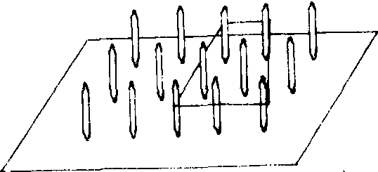 在一个方形的小木板上,钉上一些木制小钉子(硬塑制的也可以),钉子间行距、间距相等,就做成了一个钉子板。如上图:幼儿可用绒线在钉子板上绕出各种几何图形,或者用橡皮筋在钉子板上绷出各种图形来。