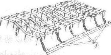 钉齿耙 钉齿耙以钢制钉齿为工作部件的耕作机具。按作业方式分固定式和调节式2种。按耙的重量分为重型、中型和轻型3种。耕作深度一般为5~6 cm,耙齿的长度通常为耕深的2~2.5倍。 |