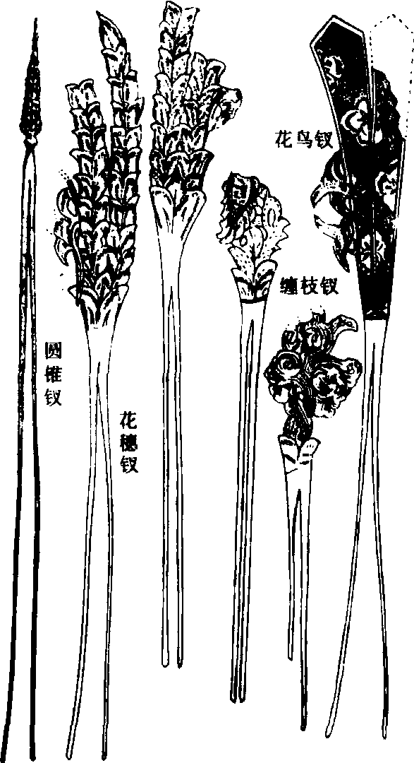 钗 钗古代妇女用来束结发髻的首饰。《释名疏证补》 “钗,叉也,象叉之形,因名之也。” 因钗的形制像枝叉状,故名 “钗”。钗为双股制饰物,最早出现于春秋,以动物的肢骨做成,称“骨钗”。秦时,“始皇又以金银作凤头,以玳瑁为脚,号曰凤钗”。西汉时也多以金银丝为之,也有象牙、玳瑁或玉制。隋唐时,宫中贵妇盛行高髻,发钗的作用更大,形制也多样起来,常以两种或两种以上的材料制成,并镶嵌上珠宝玉翠。还有的在钗首雕刻出各种形状的花朵,称为 “花钗”。花钗制料的贵贱及花朵数量的多少是品位高低的标志。隋朝,后妃命妇所戴花钗的数目,随品级有具体规定。据《隋书·礼仪志》载: “皇后首饰,花十二树。皇太子妃,公主,王妃,三师、三公及公夫人,一品命妇,并九树。侯夫人,二品命妇,并八树。伯夫人,三品命妇,并七树。子夫人,世妇及皇太子昭训,四品以上官命妇,并六树。男夫人、五品命妇,五树。女御及皇太子良娣,三树。”至唐、宋、元、明时,除规定后妃、命妇所戴花钗株树,承前制外,钗的花样更多。质料除金、玉、银、象牙,还有珊瑚、琥珀、翡翠等。制作工艺也更为精美,不仅有刻花还有雕镂和盘花。钗首除鸟兽雕刻外,还有宫殿、人马等图案,甚至在钗柄上精雕出诗句。这些以金、银、珠宝做成的钗,是历代贵族妇女专用的名贵饰物,庶人妇女只能饰用木钗或铜钗。明代曾明确规定庶人妇女: “首饰、钗、镯不许用金、玉、珠翠,止用银。”清代,因推行满族服装,贵族妇女一般要在发髻上戴一扇形称为“宫装” 的冠。故头上饰物多用簪而少用钗了。